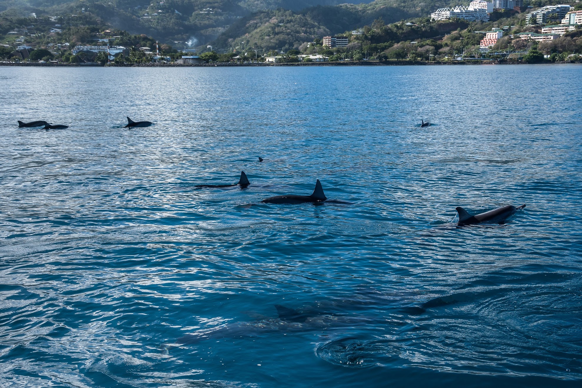 Après 5 minutes d’attente supplémentaire, les voilà ! Les dauphins sont « ponctuels ». Notre guide repère un petit aileron triangulaire plus au nord, à quelques mètres de nous. Et comme un aileron en cache souvent un autre, en approchant la zone nous comptons au moins 30 dauphins. Nous les rejoignons à faible vitesse. Quelques individus se regroupent aussitôt à l’avant du bateau. Ceux sont de très beaux dauphins à long bec, des habitués des côtes tahitiennes. A allure constante, nous contemplons une dizaine de dauphins jouant à la proue du bateau. Mes compagnons mitraillent la scène et nous profitons tous de cette quiétude. Les dauphins s’éclatent. Un peu plus loin, un petit groupe isolé nous offre même quelques petits sauts, vrilles, saltos… un festival !